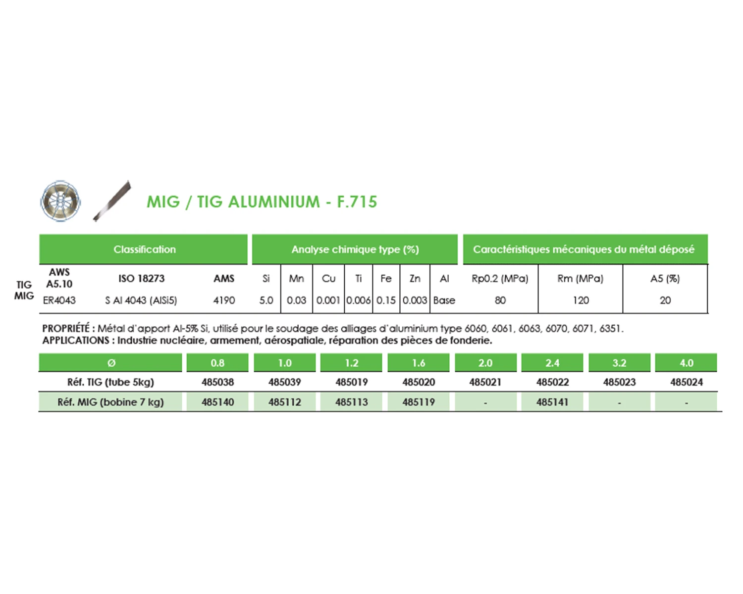 • PROPRIÉTÉ : Métal d’apport Al-5% Si, utilisé pour le soudage des alliages d’aluminium type 6060, 6061, 6063, 6070, 6071, 6351.