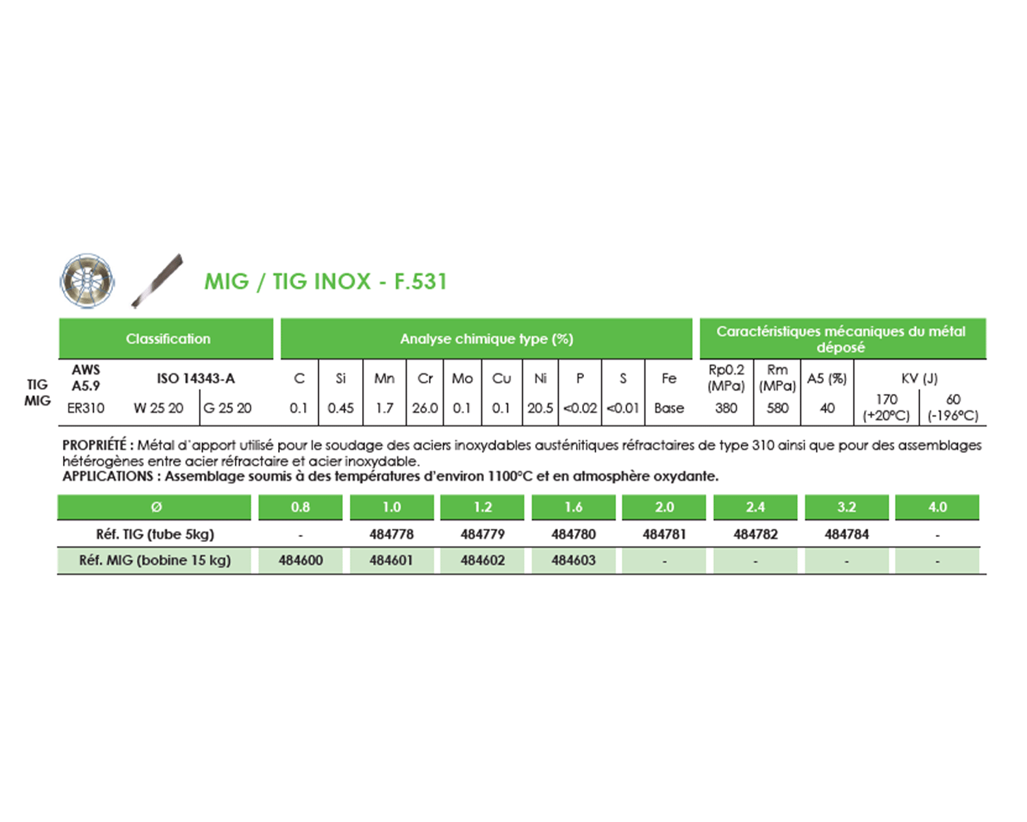 • PROPRIÉTÉ : Métal d’apport utilisé pour le soudage des aciers inoxydables austénitiques réfractaires de type 310 ainsi que pour des assemblages hétérogènes entre acier réfractaire et acier inoxydable.