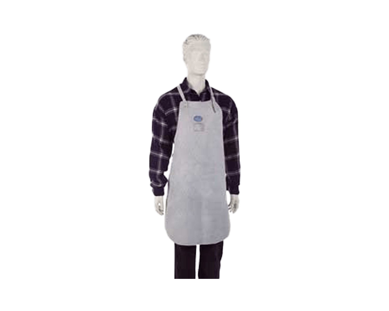 Tablier pour soudeur, d’ une pièce en cuir croûte avec bavette.