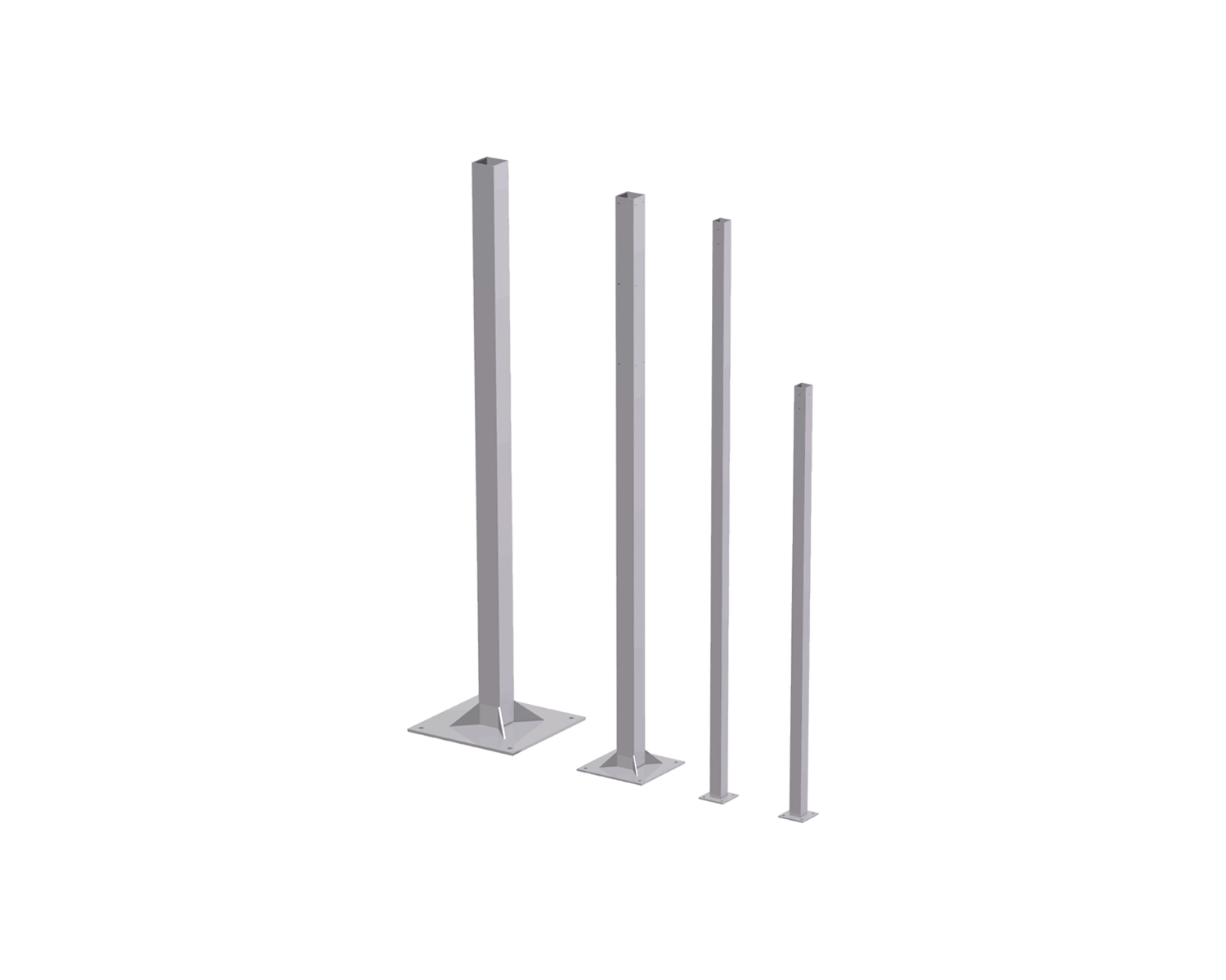 Poteau carré (100 x 100 x 4 mm) sur base (500 x 500 x 15 mm). Hauteur